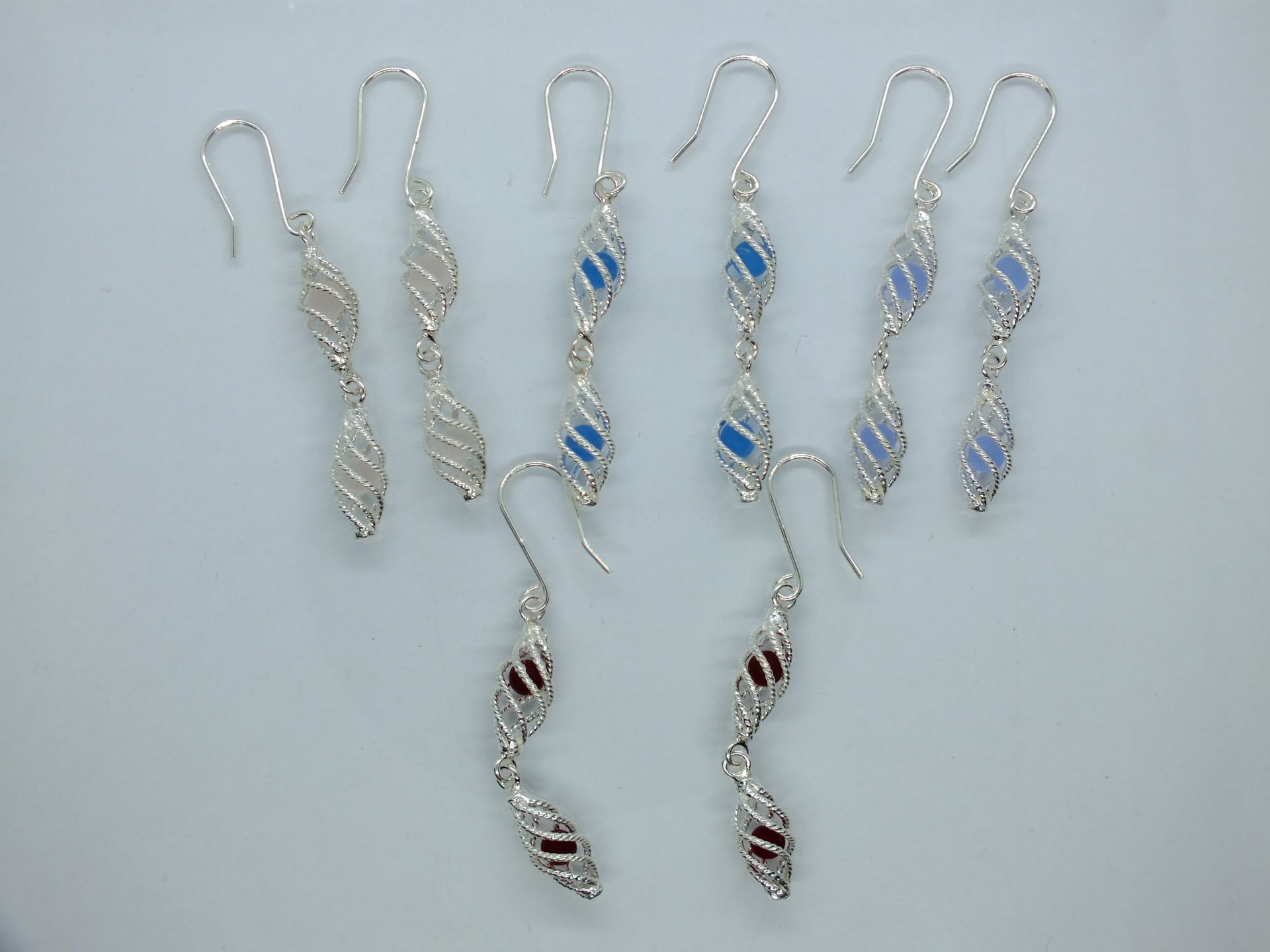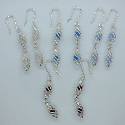 Női ezüst függő fülbevaló spirál formával,közepében színes golyócskákkal (bordó,halvány rózsaszín).Színválasztást a megjegyzés rovatnál kell feltüntetni.