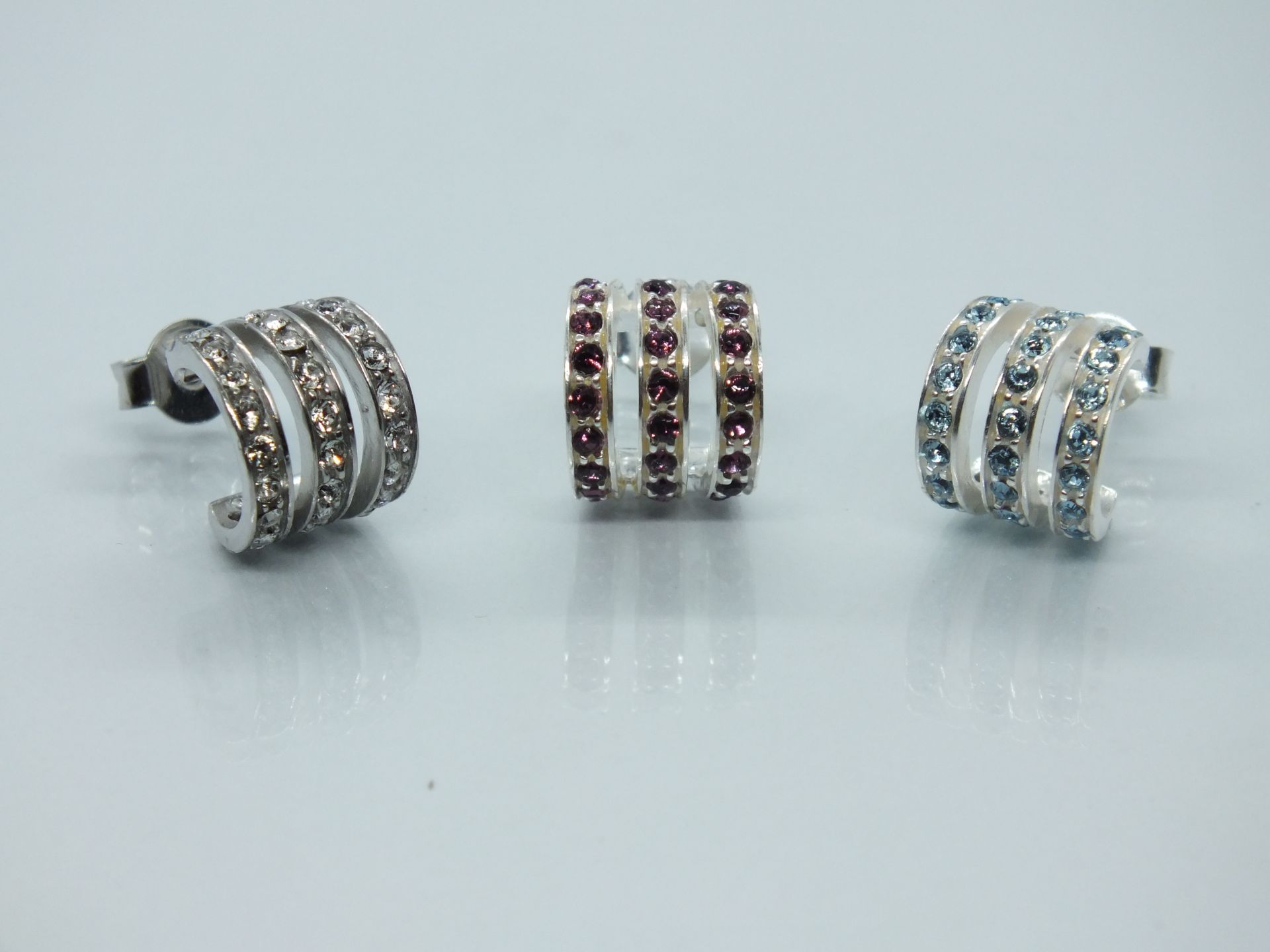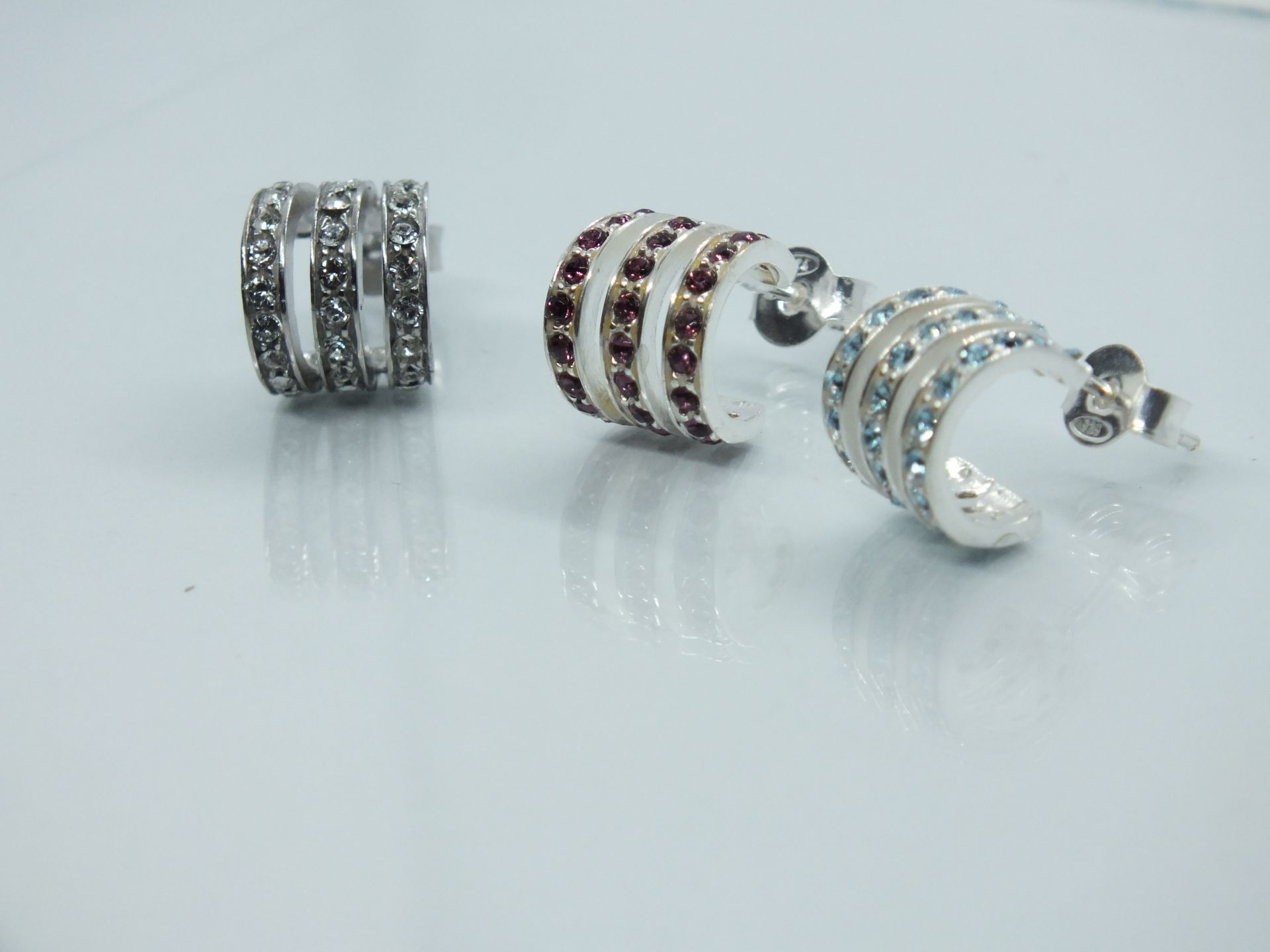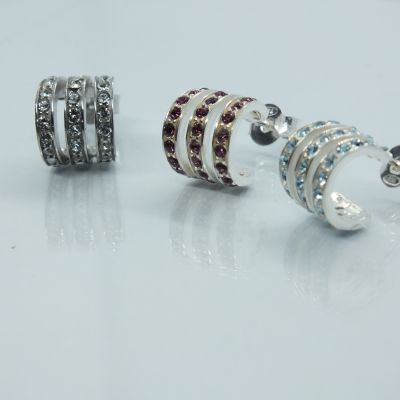 Női ezüst fülbevaló,nem teljes kör alakja 3 sorban kissé szétváló sorok átlátszó és színes swarovski kövekkel díszített.
