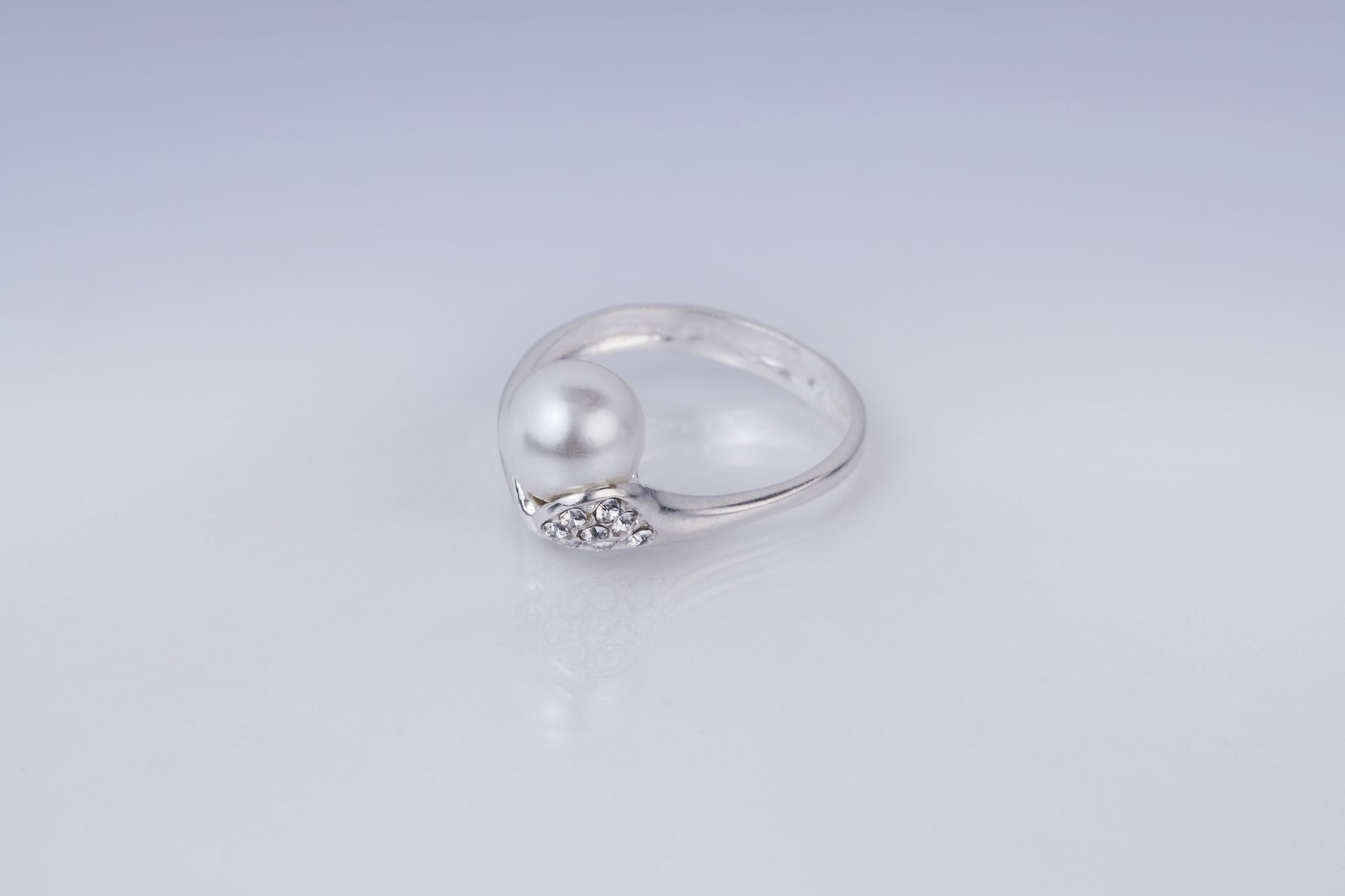 Ezüst női gyűrű,félig levélformába foglalt gyönggyel és cirkóniával díszítve. Színválasztást a megjegyzés rovatnál kell feltüntetni.