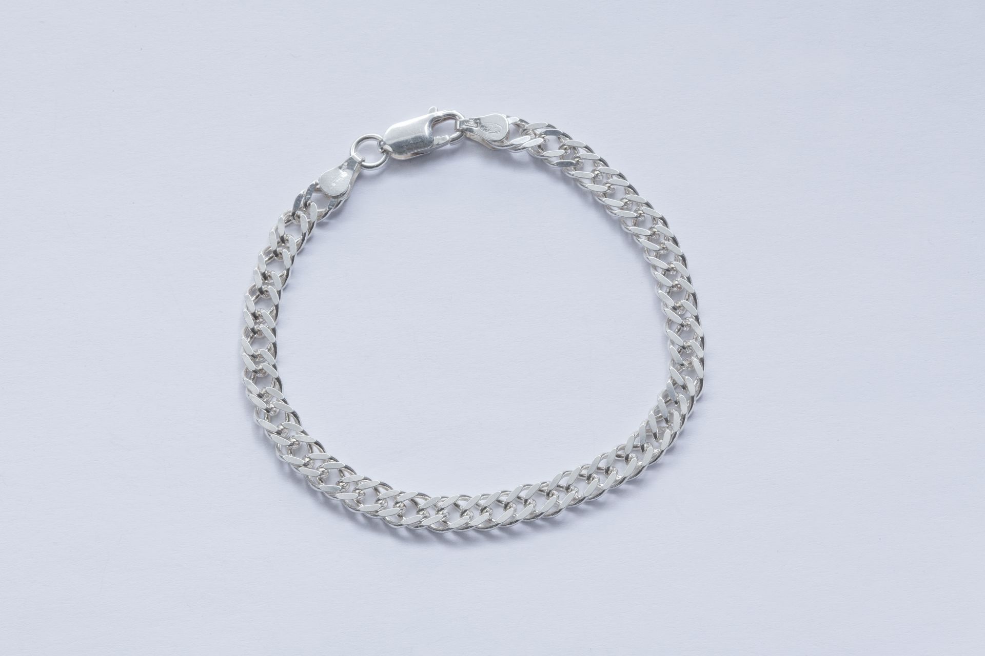 Ezüst női lapos karkötő dupla pancer stílus. Karkötő hossza:19cm Szélessége:5,6mm Vastagsága:1,9mm