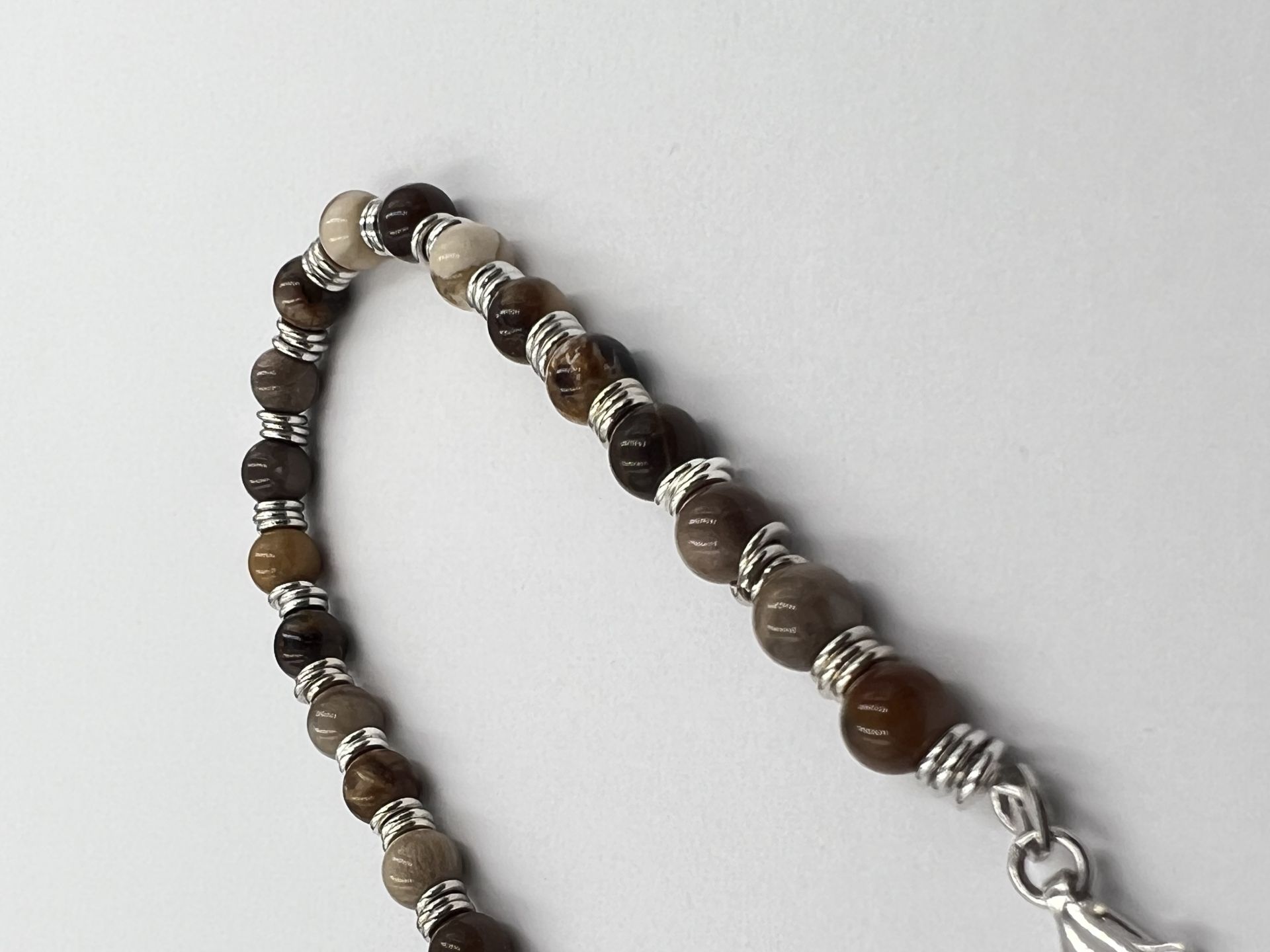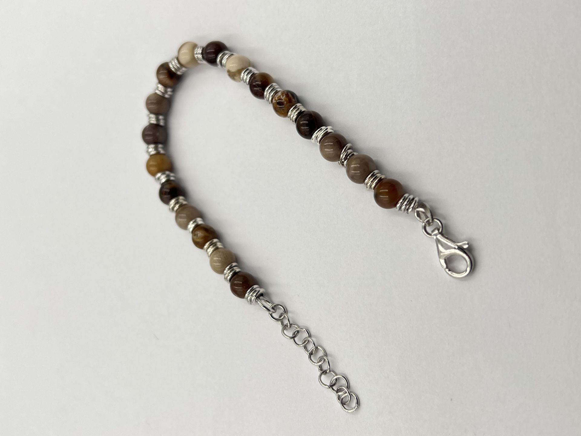 Ezüst női karkötő barna színű gyöngyökkel díszítve.