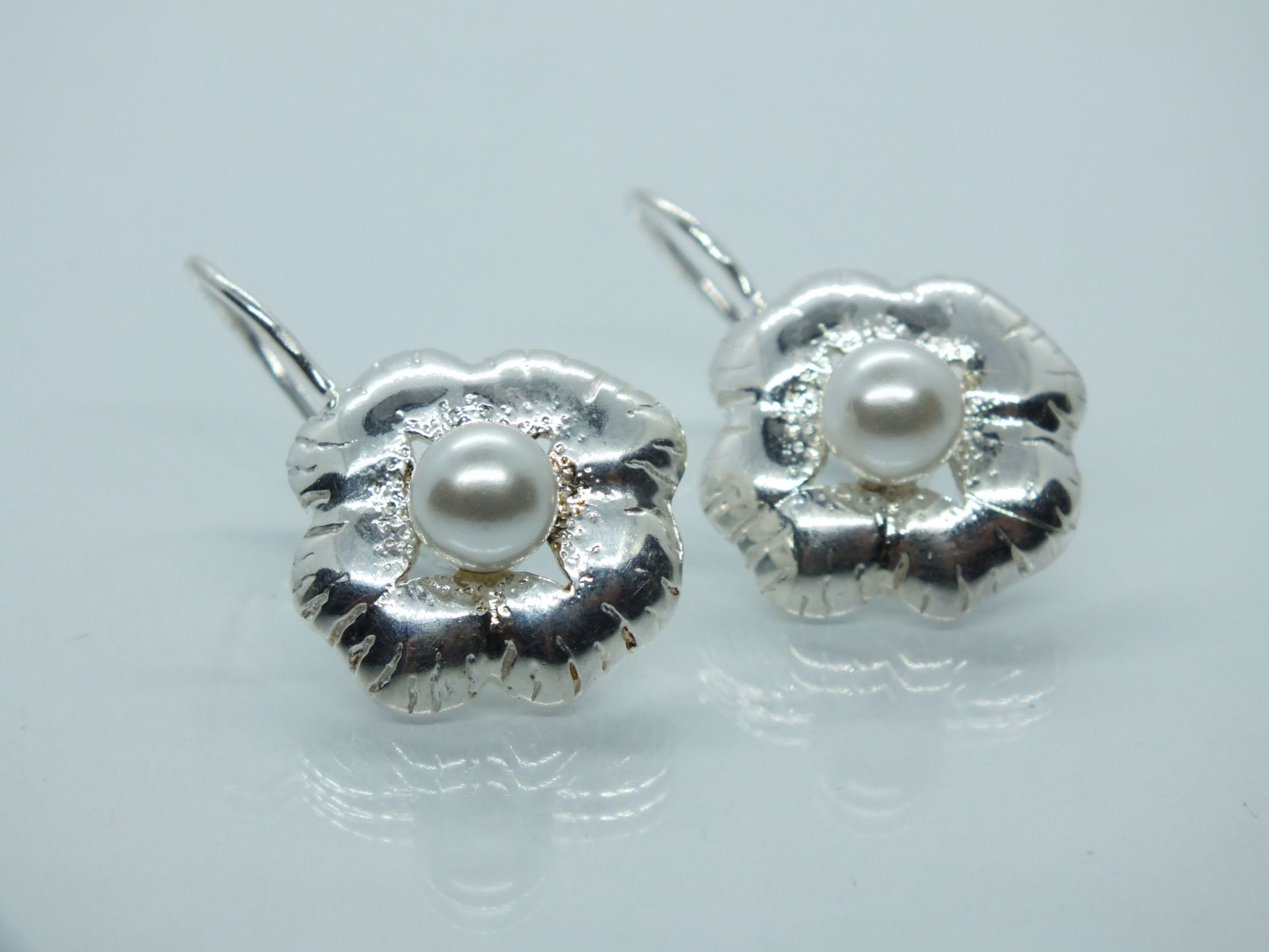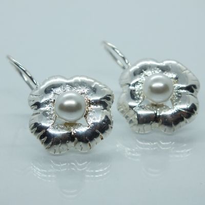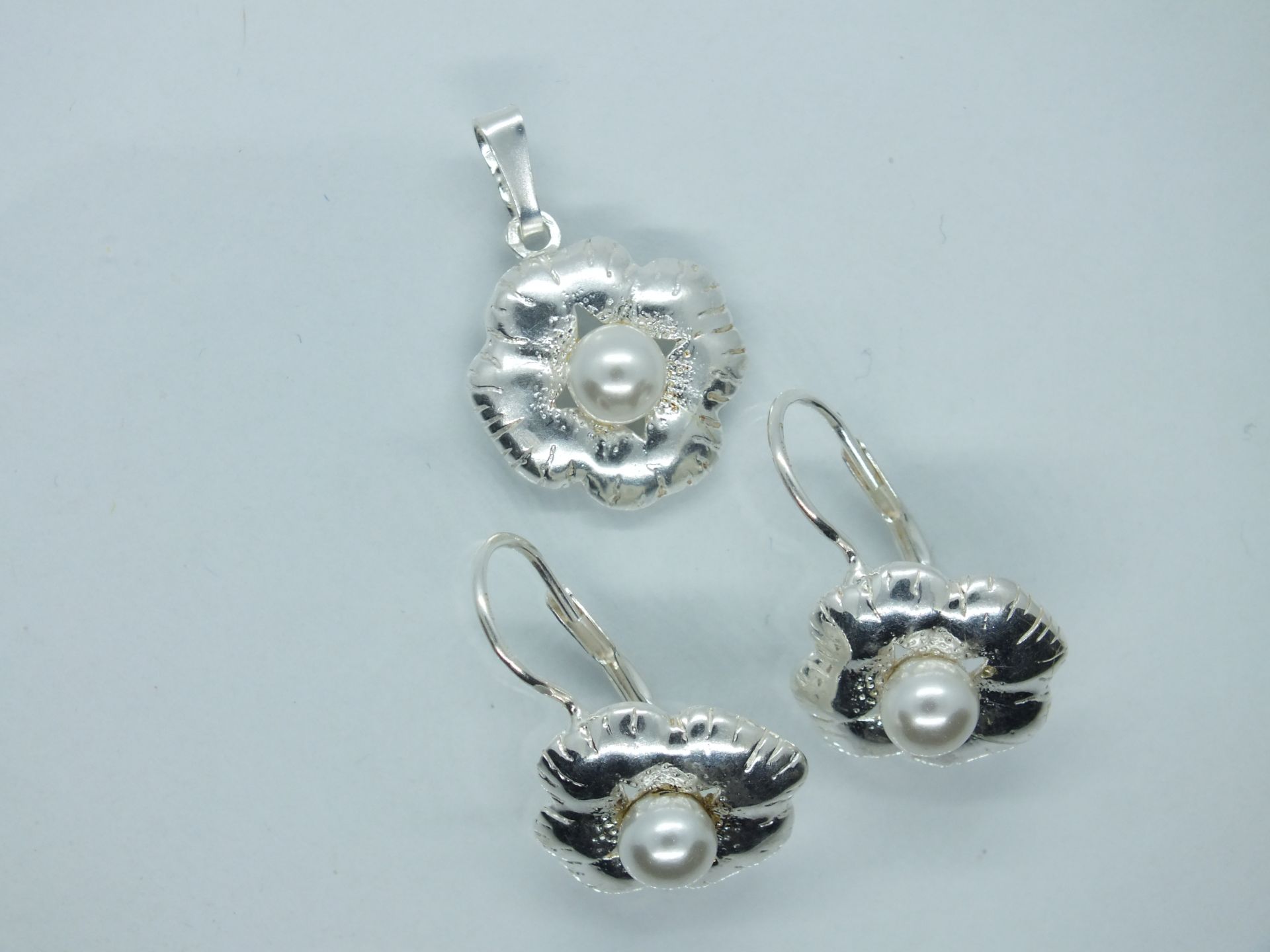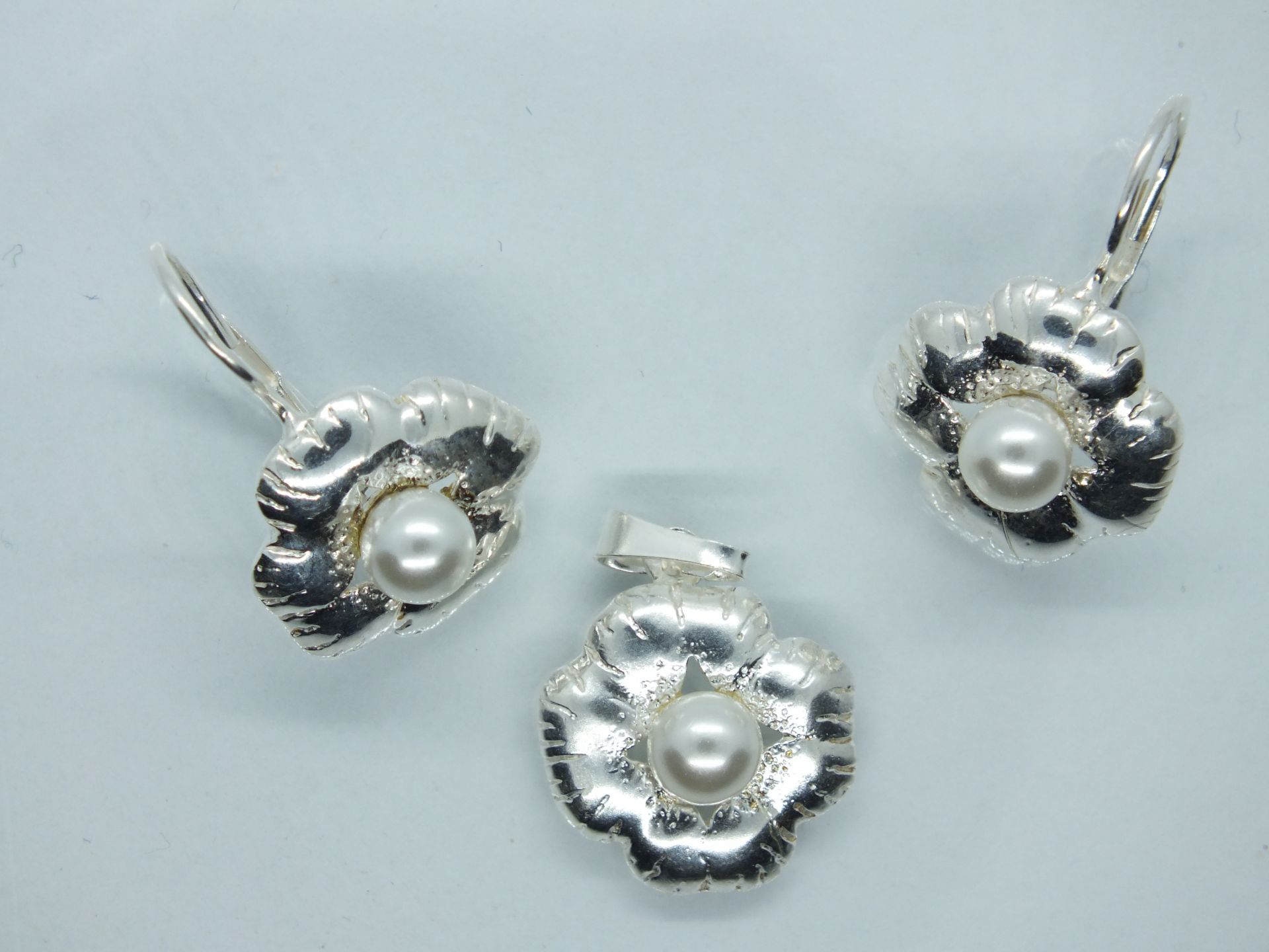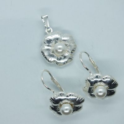 Ezüst női szett fülbevalóval és medállal.Virág forma középen fehér gyöngy berakással.