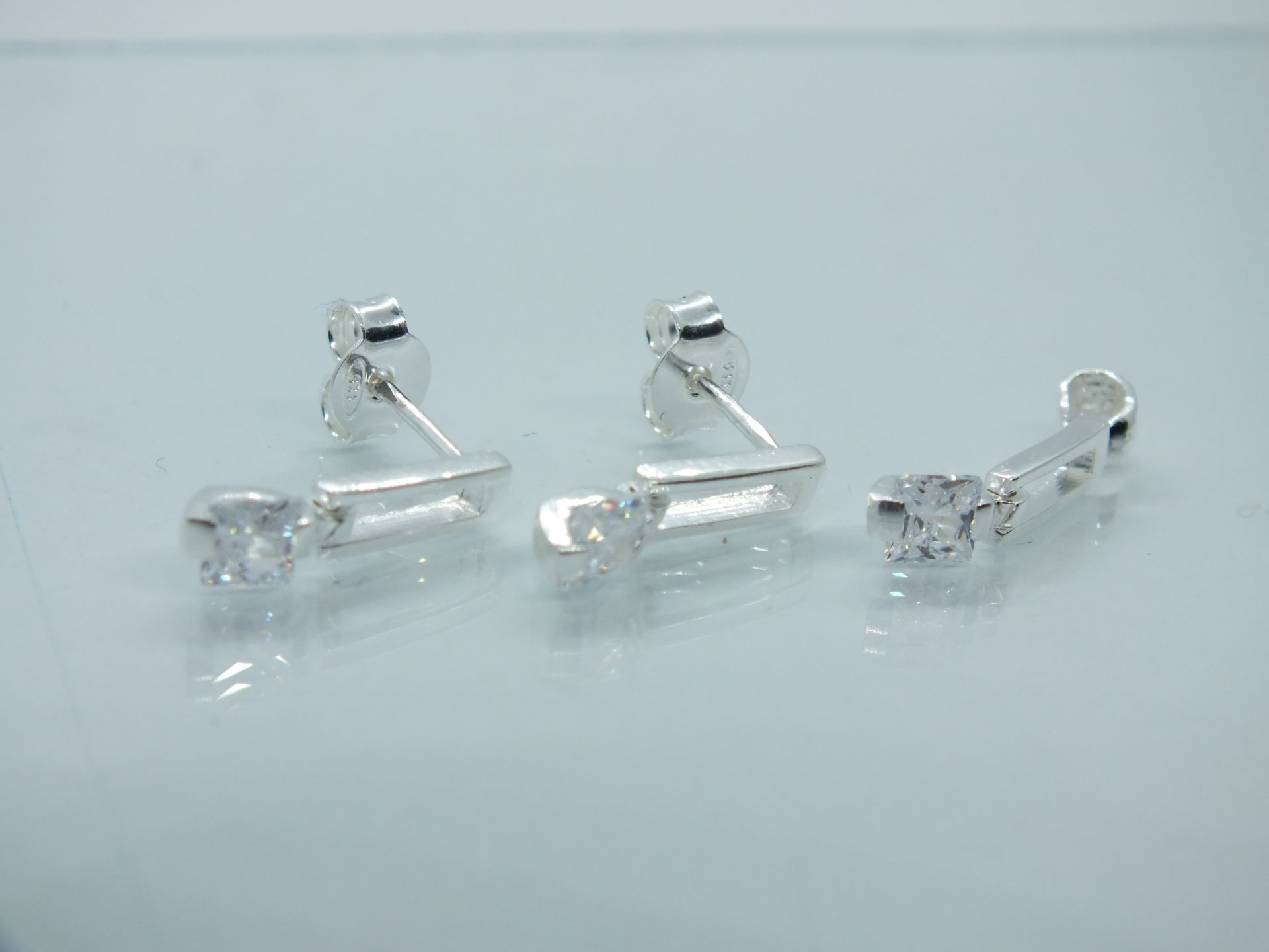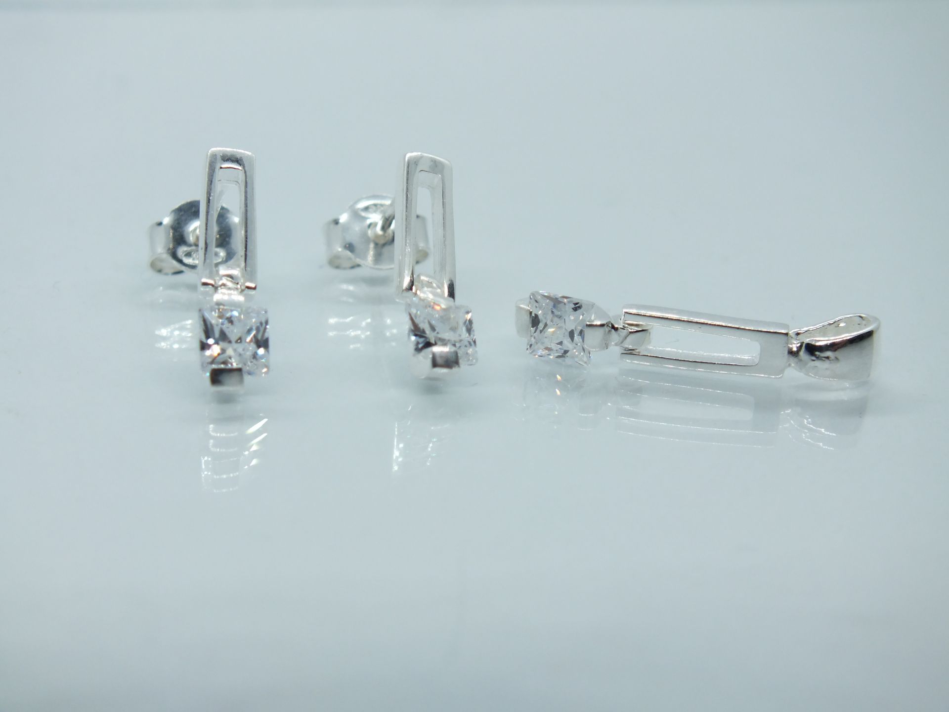 Ezüst női szett fülbevalóval és medállal.Téglalap vonalak,végén négyzet alakú átlátszó cirkónia kő foglalatban.