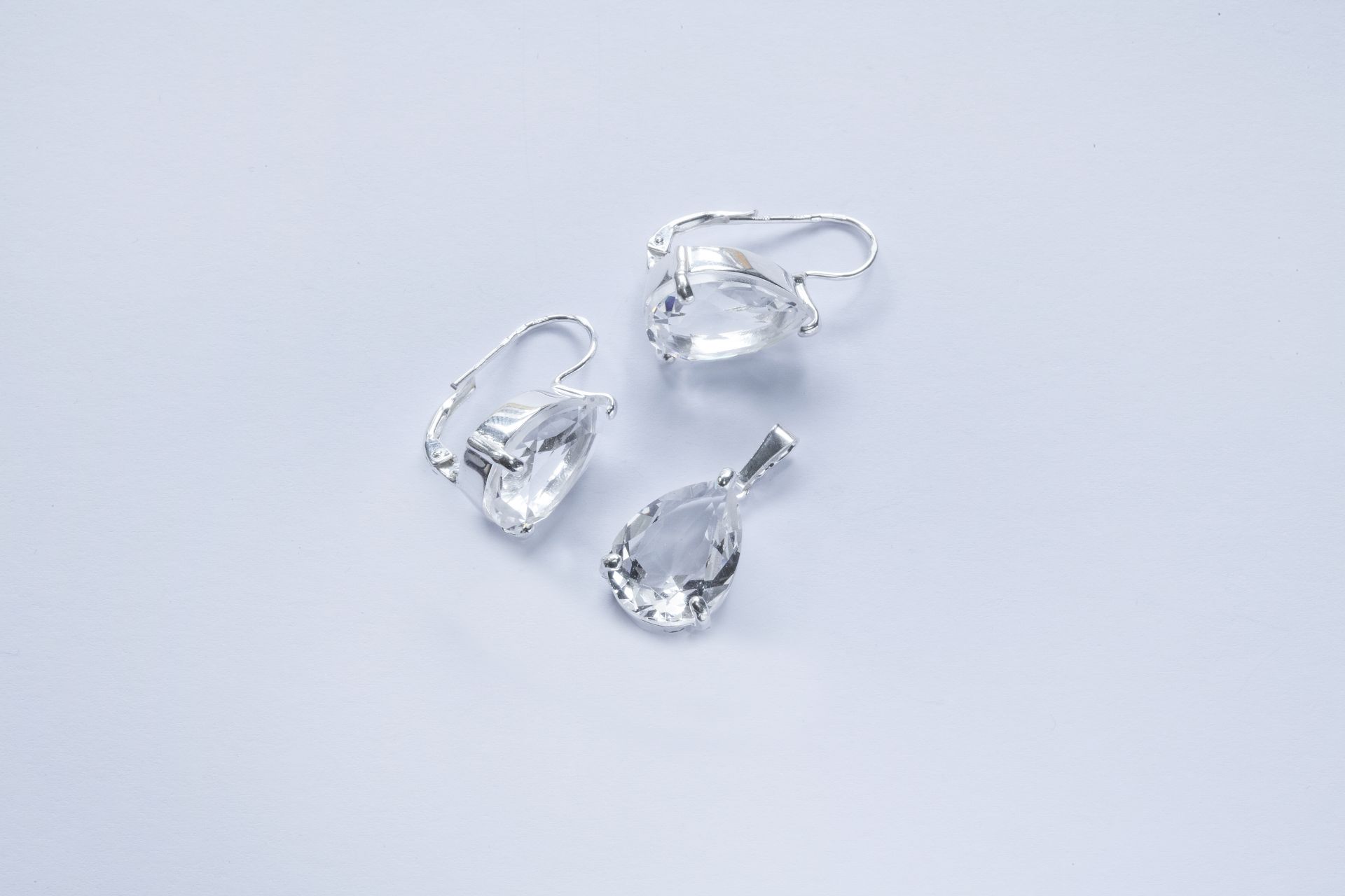 Ezüst női szett medállal és fülbevalóval. Csepp alakú átlátszó cirkónia kő foglalatban.