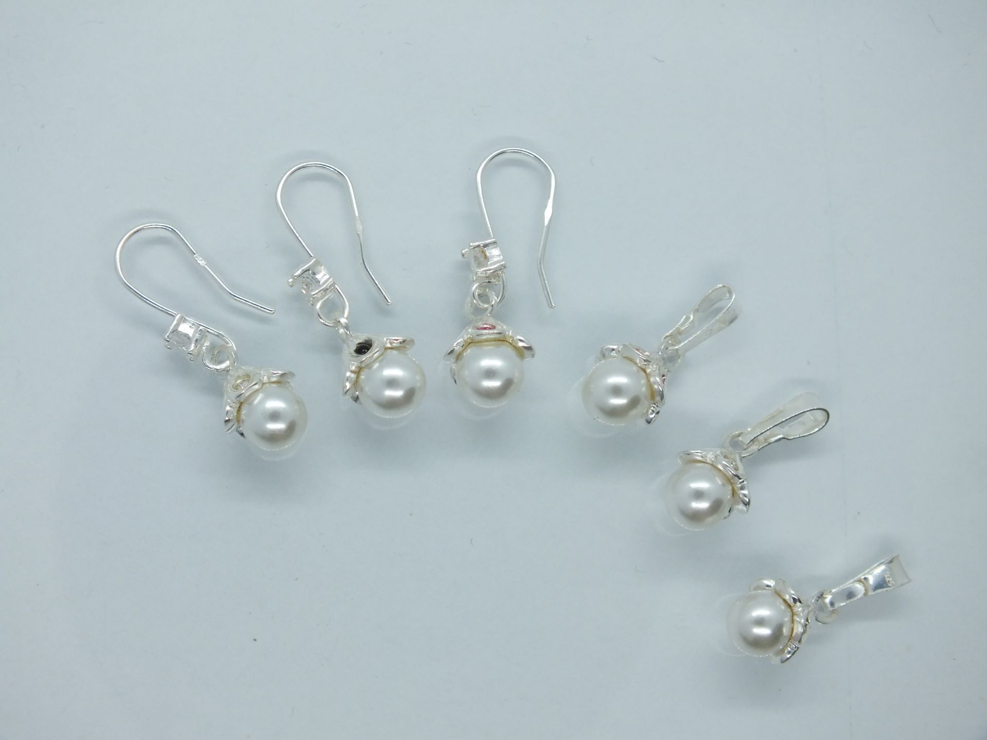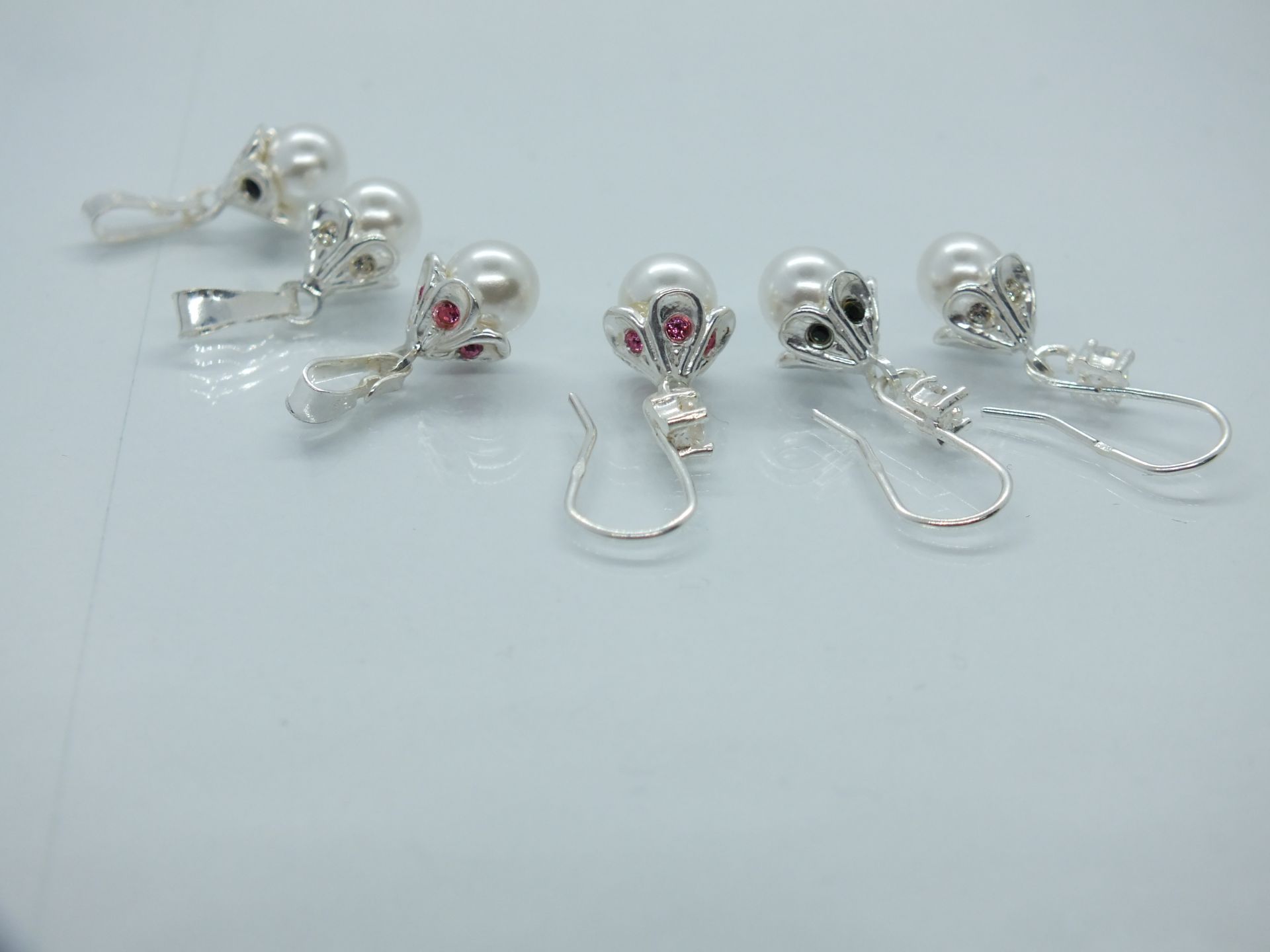 Ezüst női szett fülbevalóval és medállal.Virág alakú forma fehér gyönggyel.A virág szirmok átlátszó,rózsaszín